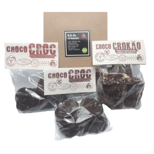 Banana passa em pedaços coberta com chocolate e nibs de cacau. Banana desidratada, sem adição de açúcar e sem conservante