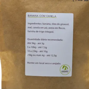 Biscoitos 100% naturais, sem adição de corantes artificiais e conservantes. Indicado para cães e gatos. Feito com banana, óleo de girassol, mel, canela em pó, aveia em flocos, farinha de trigo integral.